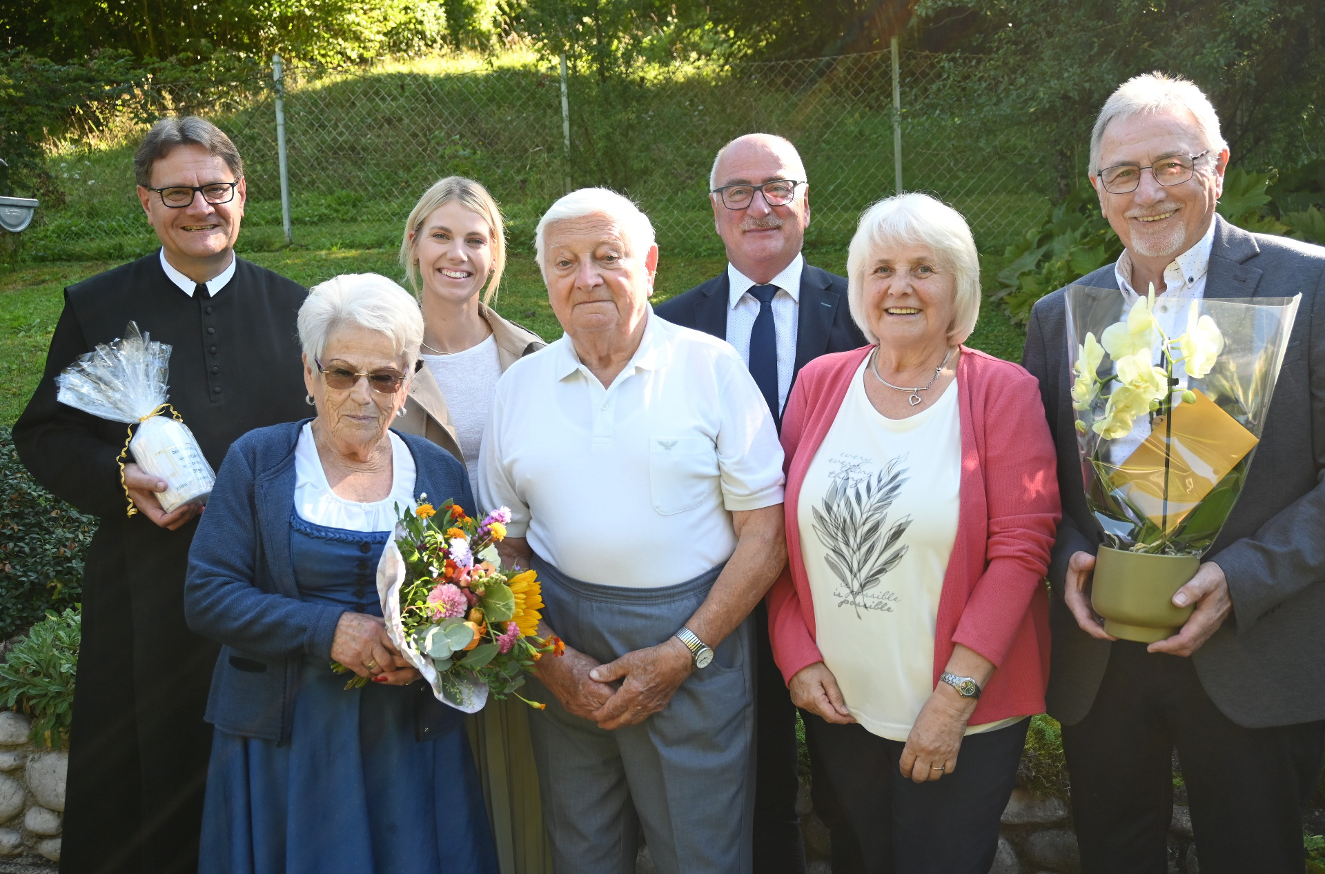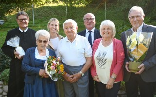 Dechant P. Jacobus Tisch, Jubelpaar Edda und Leopold Koller, Mag. Alina Stockinger (BH Amstetten), Bgm. Gerhard Lueger, Gertrude und Hubert Moises (Pensionisten Ybbsitz).