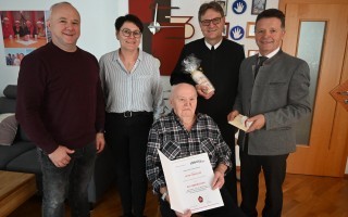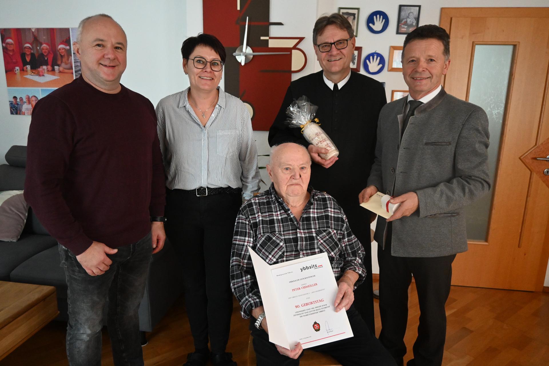 Jubilar Peter Oismüller mit Familie, Dechant P. Jacobus Tisch und Vizebgm. Georg Stockner