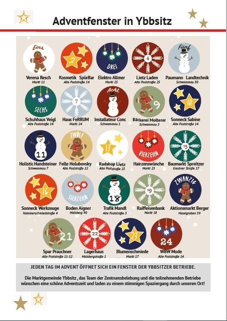 Die Marktgemeinde Ybbsitz, das Team der Zentrumsbelebung und die teilnehmenden Betriebe wünschen eine schöne Adventzeit und laden zu einem stimmigen Spaziergang durch unseren Ort!