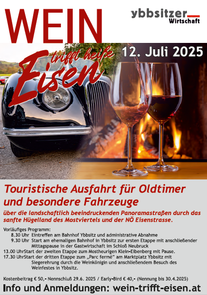 17.30 Uhr Start der dritten Etappe zum "Parc fermé" am Marktplatz Ybbsitz mit Siegerehrung durch die Weinkönigin und anschließ. Besuch des Weinfestes Ybbsitz.