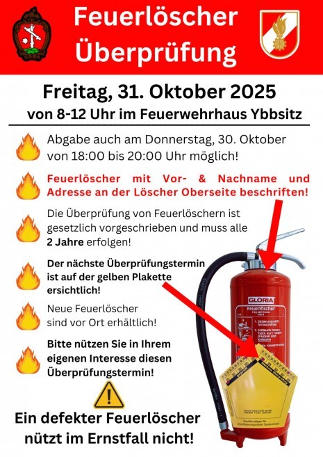 Feuerlöscherüberprüfung: Freitag, 31. Okt. 2025, 8.00 - 12.00 Uhr