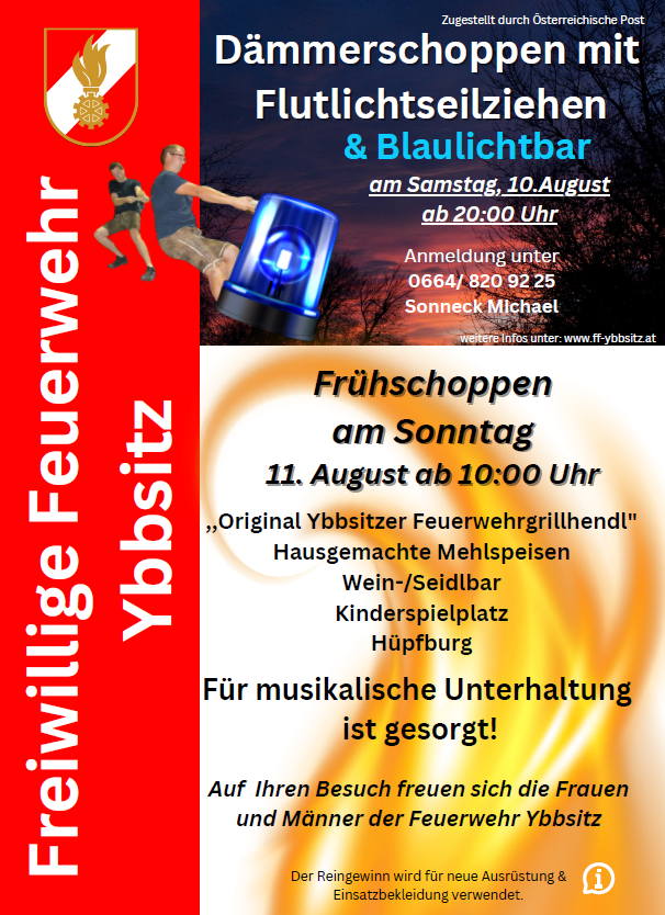 Die Mannschaft der FF Ybbsitz lädt herzlich zum traditionellen Frühschoppen am Sonntag, 11. August 2024 ab 10.00 Uhr beim Feuerwehrhaus ein!