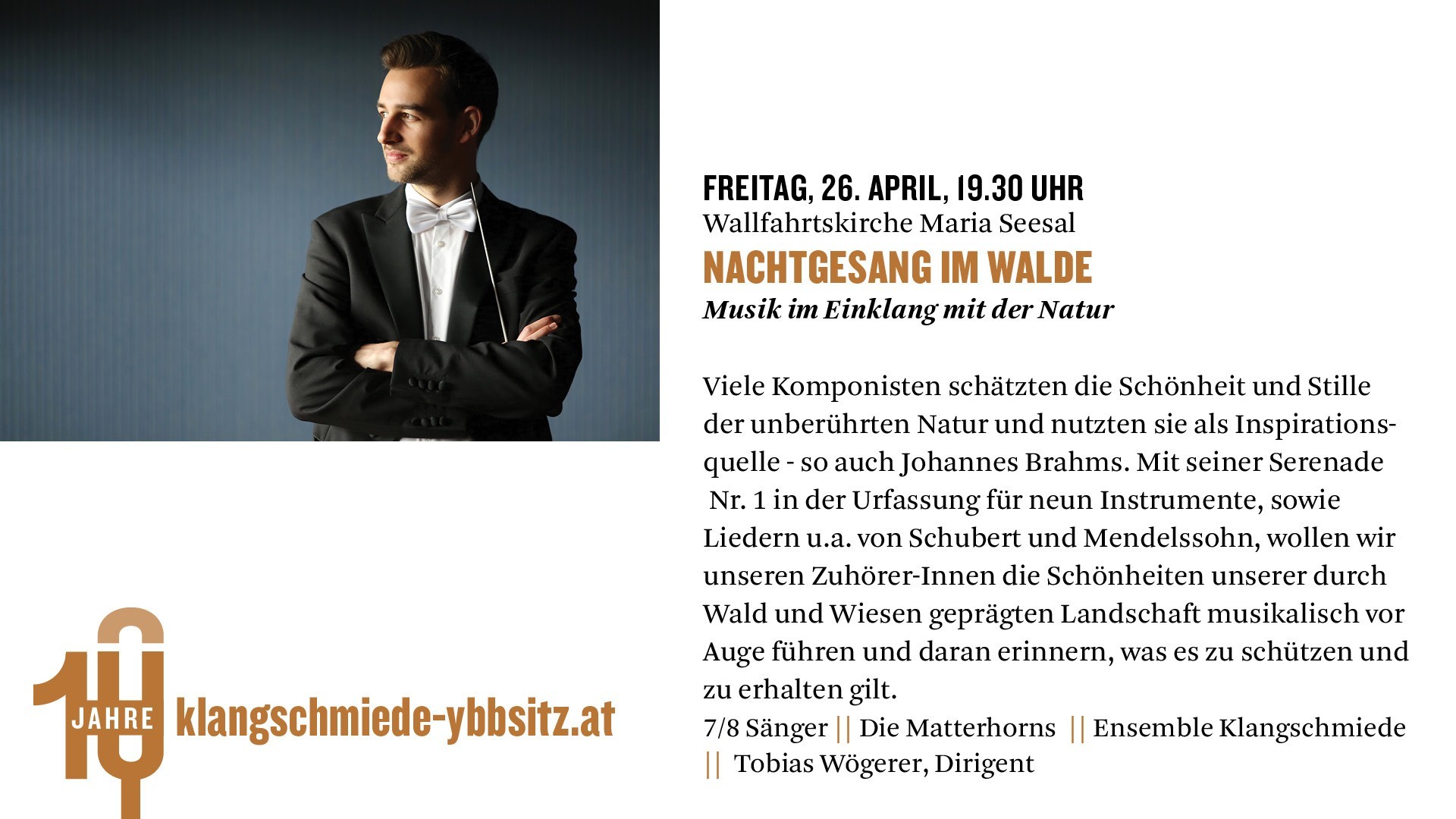 Viele Komponisten schätzten die Schönheit und Stille der unberührten Natur und nutzten sie als Inspirationsquelle - so auch Johannes Brahms. Mit seiner Serenade Nr. 1 in der Urfassung für neun Instrumente, sowie Liedern u.a. von Schubert und Mendelssohn, wollen wir unseren ZuhörerInnen die Schönheiten unserer durch Wald und Wiesen geprägten Landschaft musikalisch vor Auge führen und daran erinnern, was es zu schützen und zu erhalten gilt.