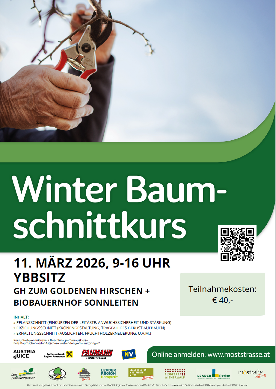 Damit Obstbäume vital bleiben und Jahr für Jahr qualitativ hochwertige Früchte tragen, sind ein sachkundiger Schnitt und die richtige Pflege unerlässlich. Dieses Know-how vermitteln die Eisenstraße Niederösterreich in Kooperation mit der benachbarten Moststraße. Unterstützt wird das Kursangebot vom Land Niederösterreich.
