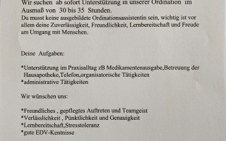 Mitarbeiter(in) ab sofort zur Unterstützung in der Ordination im Ausmaß von 30 bis 35 Wochenstunden gesucht!