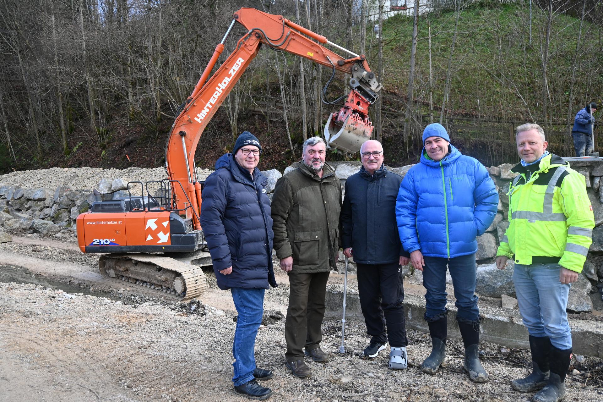 Franz Deinhofer (Flußbau Land NÖ), gGR Herbert Fahrnberger, Bgm. Gerhard Lueger, Ing. Oliver Huber (Flußbau Land NÖ) und DI Georg Bauernfried (Fa. IBL)