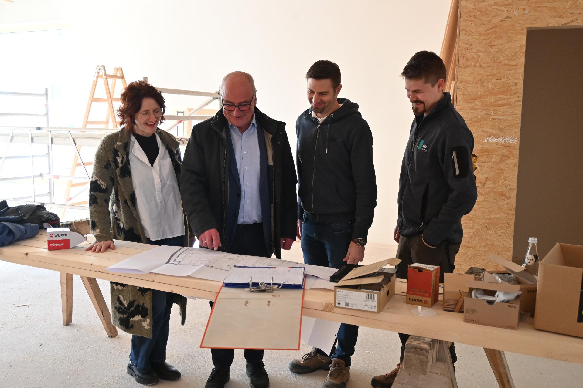 Kindergartenleiterin Silvia Kaltenbrunner, Bürgermeister Gerhard Lueger, Bauleiter Christian Reisinger von der Firma Stockinger Baumanagement sowie Markus Füsselberger von der Firma WEFA überzeugten sich persönlich vom aktuellen Stand der Arbeiten.