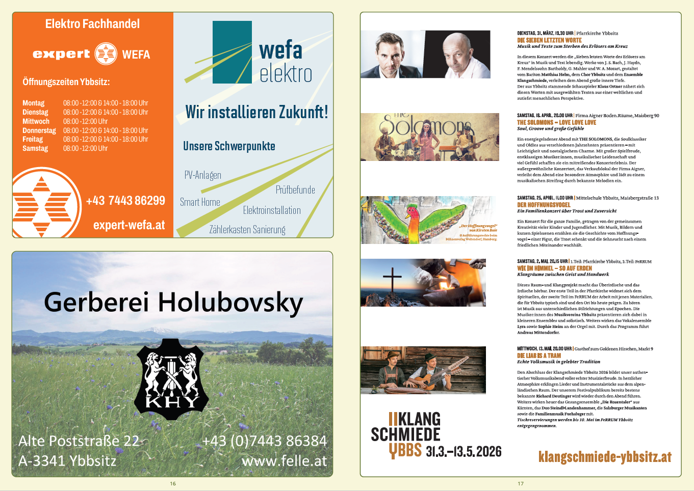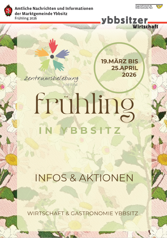 Mit dem Postwurf "Frühling in Ybbsitz" haben Sie einen Überblick, ich freue mich, wenn Sie die Angebote im Sinn eines lebens- und liebenswerten Ybbsitz annehmen. Vielen Dank!