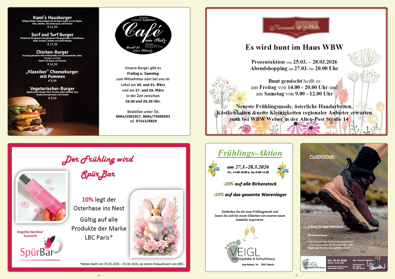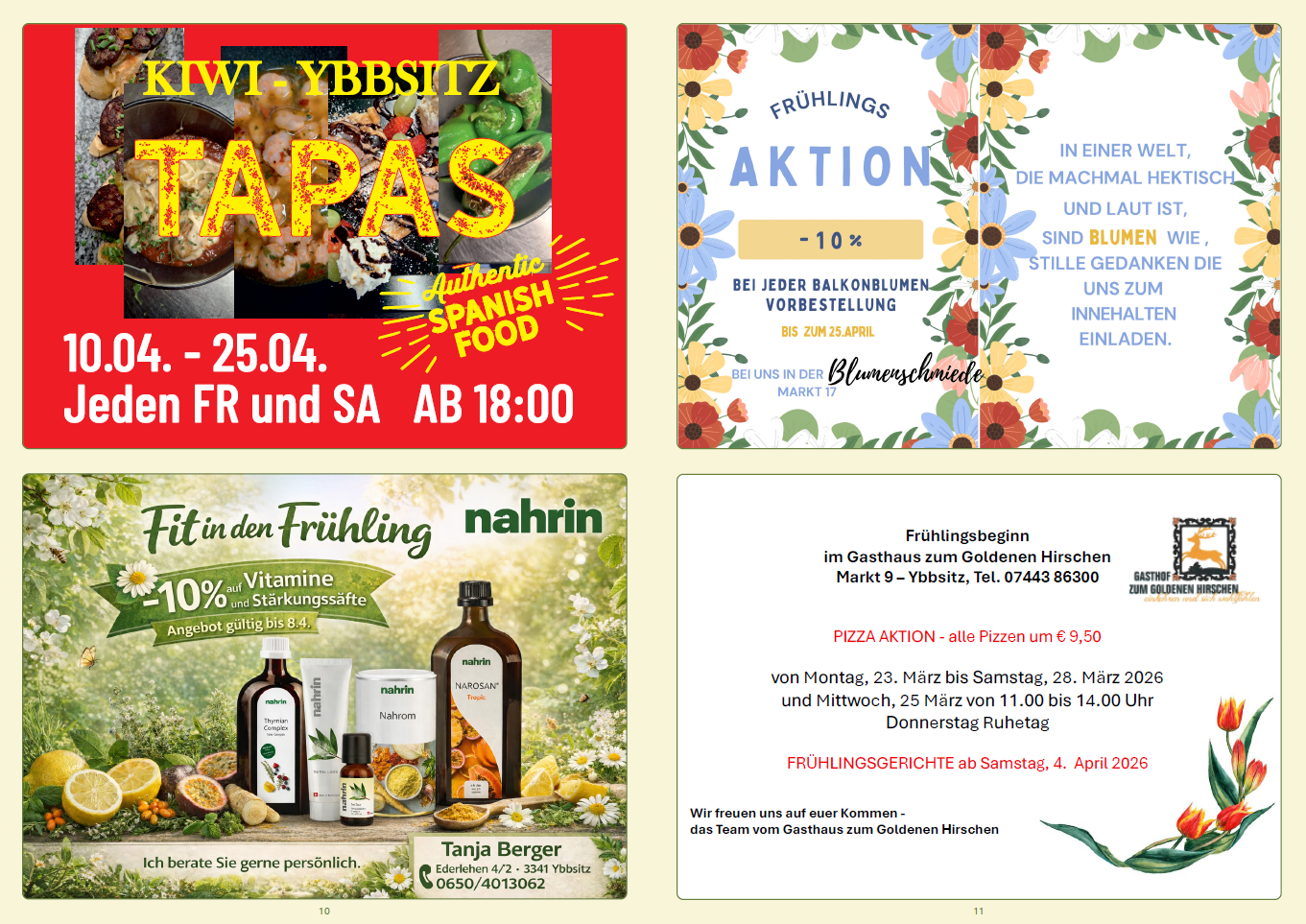 Das Team der Zentrumsbelebung Ybbsitz hat auch heuer wieder fleißig Aktionen und Frühlingsangebote unserer örtlichen Betriebe gesammelt. Überzeugen Sie sich selbst von der Vielfalt, die wir hier im Ort zur Verfügung haben. Wir können das Engagement unserer Betriebe bestens unterstützen, indem wir die zahlreichen Angebot annehmen, an Aktionen teilnehmen und dadurch die Gemeinschaft und Lebensqualität erhalten.