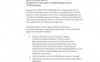 Ausgehend von Waidhofens Stadtregierung – Bgm. Werner Krammer, Vizebgm. Armin Bahr und Stadtrat Martin Dowalil – beginnt ein breit angelegter Informations- und Beteiligungsprozess zur Zukunft der Notfallversorgung in der Region. Auftakt ist eine öffentliche Informationsveranstaltung, die am Mittwoch, 15. Oktober 2025 im Plenkersaal stattfinden und zusätzlich via Live-Stream übertragen wird.