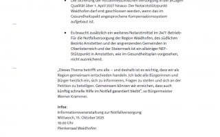 Hintergrund ist die geplante Schließung des Notarztstützpunktes in Waidhofen im Zuge der Gesundheitsreform in Niederösterreich ab 2027.
