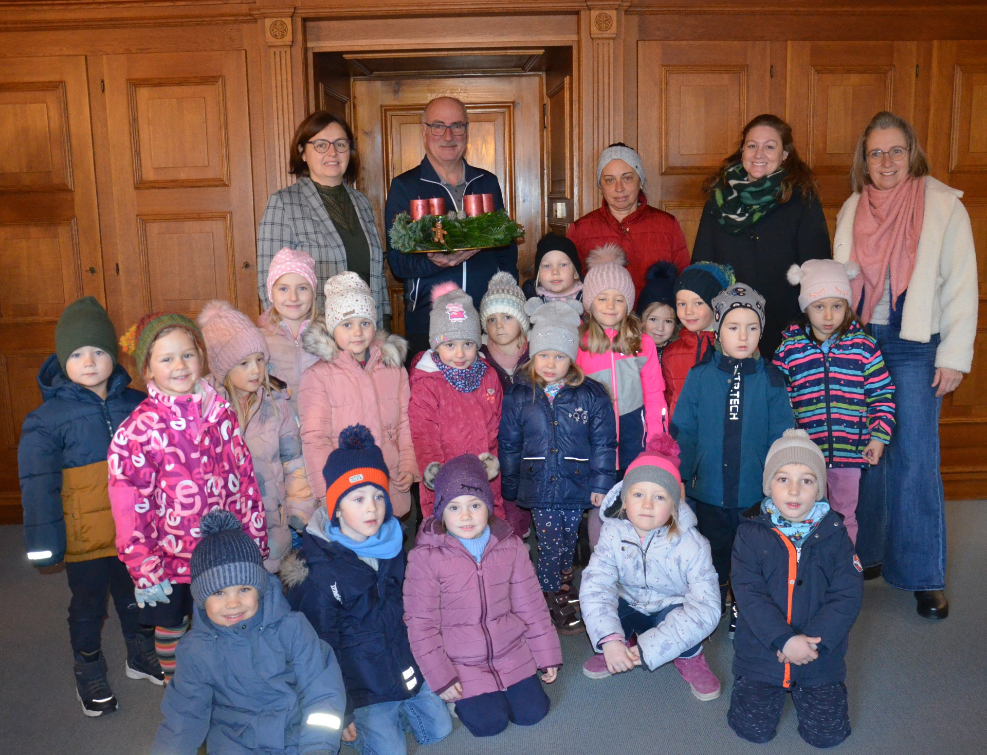 Am Freitag, 28. November 2025 überraschten die Kinder des Kindergartens 2 bei einem Besuch am Gemeindeamt Herrn Bürgermeister Gerhard Lueger mit einem Adventkranz.