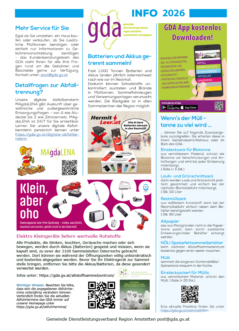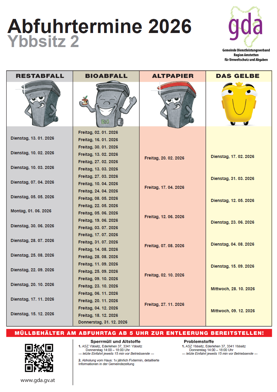Hier dürfen wir vorab die Müllpläne 2026 für RESTABFALL - BIOABFALL - ALTPAPIER - DAS GELBE für das nächste Jahr als pdf. Datei zur Verfügung stellen.