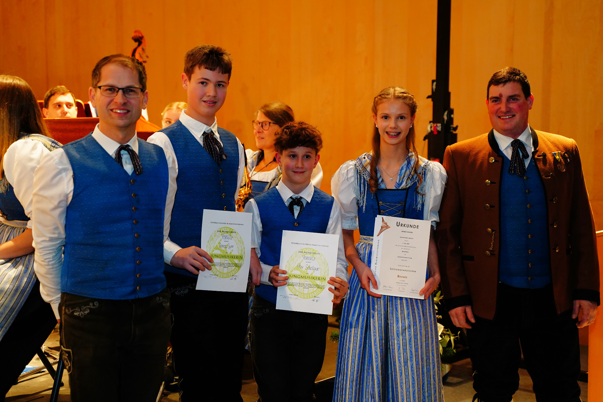 Leistungsabzeichen in Bronze: Kapellmeister Christoph Fuchsluger, Jonas Sperr, Felix Schallauer, Marie Wieser, Obmann Lukas Heigl