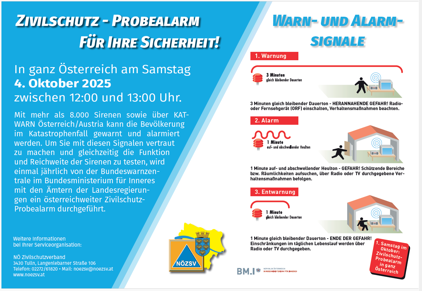 Mit mehr als 8.000 Sirenen sowie über KATWARN Österreich/Austria kann die Bevölkerung im Katastrophenfall gewarnt und alarmiert werden. Um Sie mit diesen Signalen vertraut zu machen und gleichzeitig die Funktion und Reichweite der Sirenen zu testen, wird einmal jährlich von der Bundeswarnzentrale im Bundesministerium für Inneres mit den Ämtern der Landesregierungen ein österreichweiter ZIVILSCHUTZ-PROBEALARM durchgeführt.