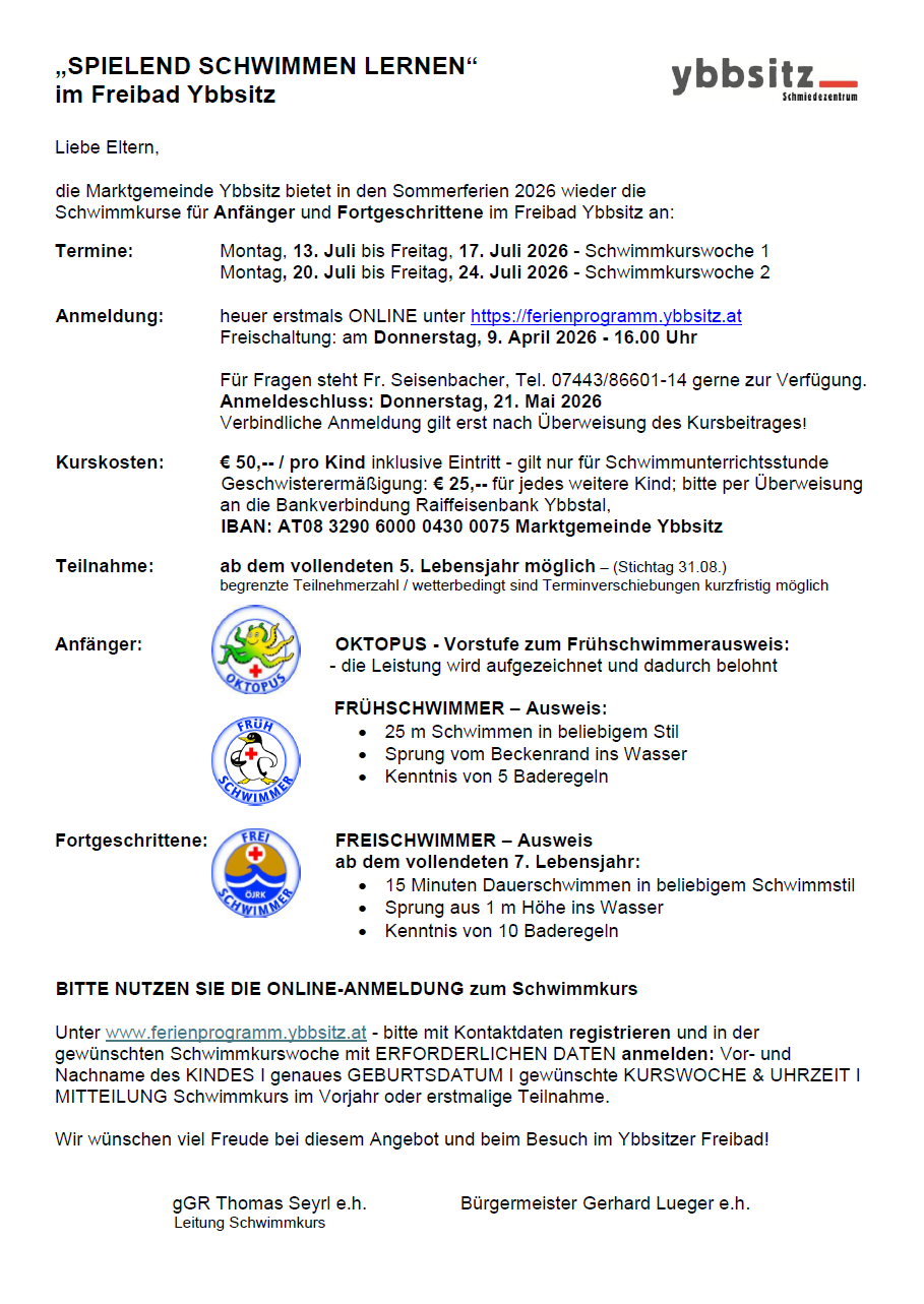 Die Marktgemeinde Ybbsitz bietet in den Sommerferien 2026 wieder die Schwimmkurse "Spielend schwimmen lernen" für Anfänger und Fortgeschrittene an. Das Angebot ist geeignet für Kinder ab dem vollendeten 5. Lebensjahr.