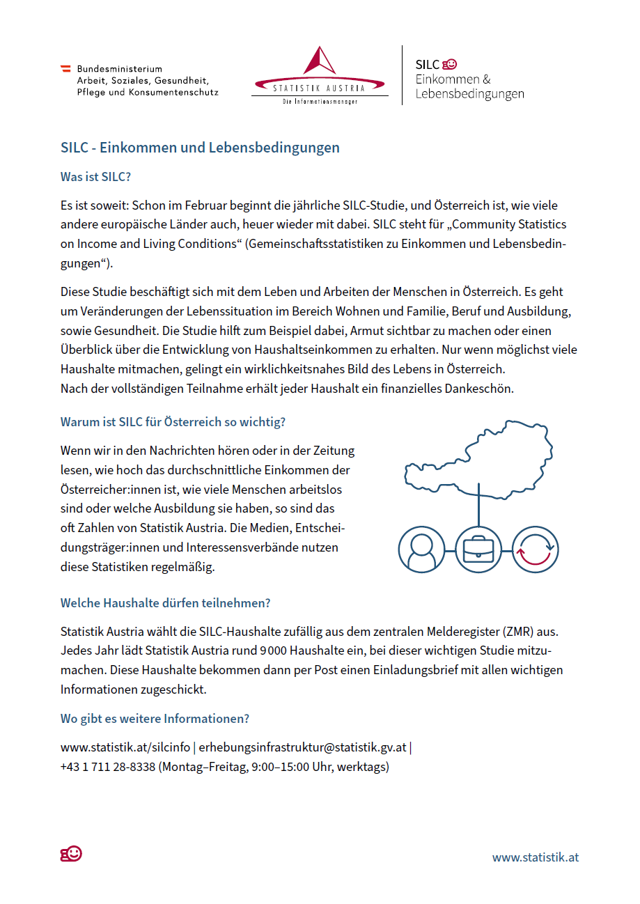 Statistik Austria führt im Auftrag des Bundesministeriums für Arbeit, Soziales, Gesundheit, Pflege und Konsumentenschutz bundesweit eine Erhebung über Einkommen und Lebensbedingungen (SILC = Statistics on Income and Living Conditions) in privaten Haushalten durch.