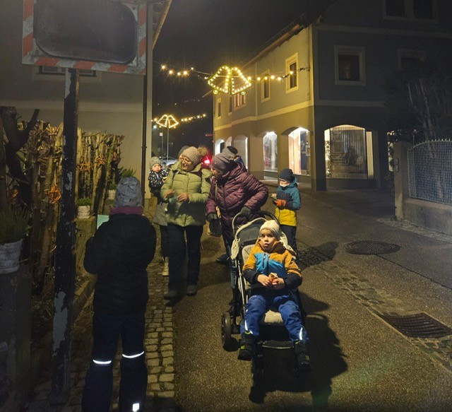 Am Freitag, 5. 12.2025 begrüßte Kulturvermittlerin Beatrix Riess zahlreiche Mütter, Omas und Kinder zum 1. Adventspaziergang durch den weihnachtlich geschmückten Ortskern. Heitere und besinnliche Geschichten sowie Wissenswertes begleiteten die Runde entlang unserer Geschäfte und geschmückten Häusern. Besondere Aufgabe für die Kinder - alle dekorativen Sterne entlang der Strecke zu zählen - und sie kamen auf eine beachtliche Zahl! Zum Abschluss führte die Tour ins Haus WBW, dort gab es Punsch und kleinen Geschenke.