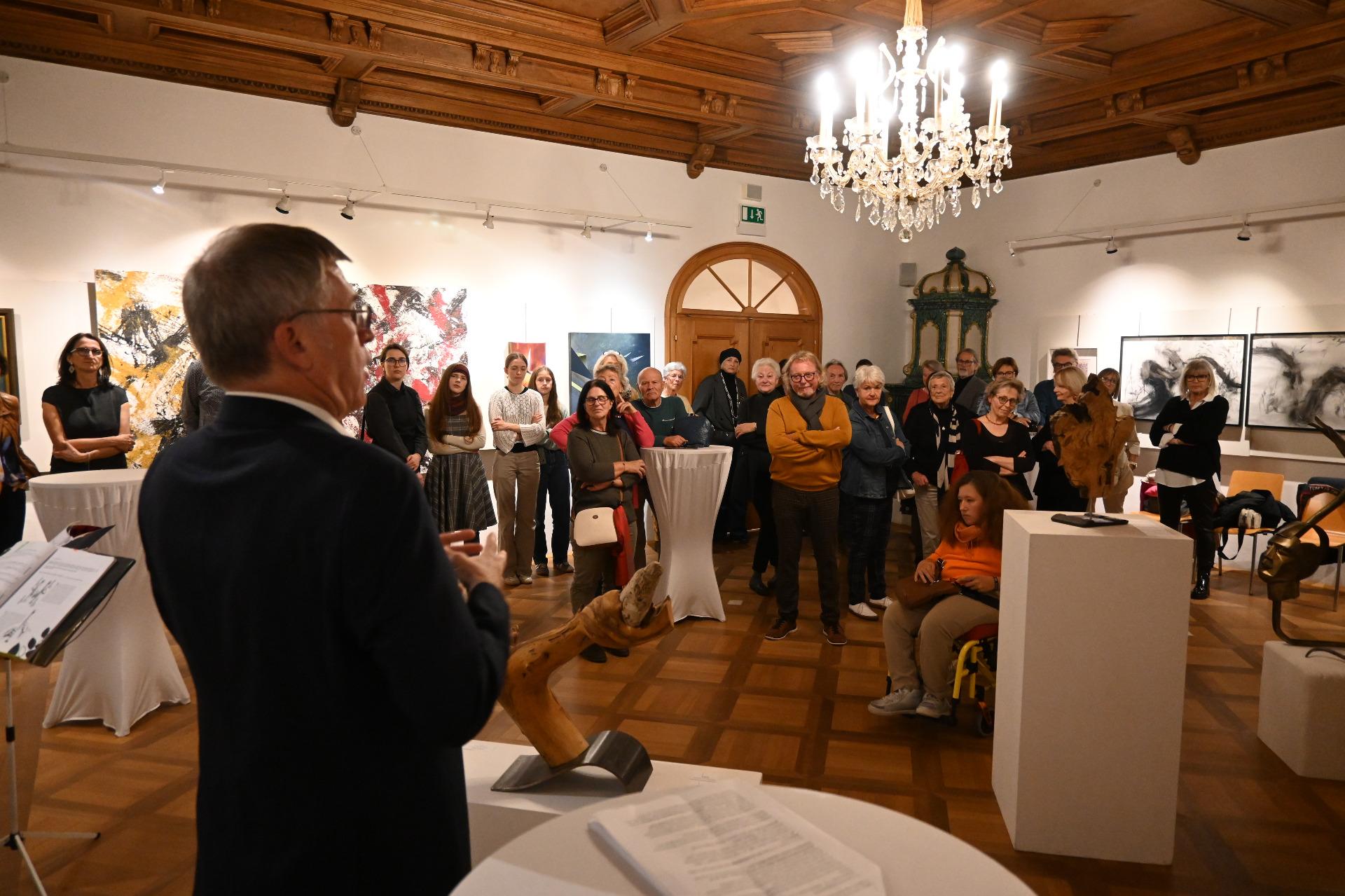 GGR Thomas Seyrl konnte in Vertretung unseres Bgm. Gerhard Lueger viele Gäste und Künstler der Ausstellung im Festsaal des Hauses FeRRUM begrüßen. Worte zur Ausstellung fand in brillanterweise Leo Lugmayr, der die einzelnen Werke und Künstler vorstellte und die verschiedenen Bedeutungen und Zugänge zum Titel "zaumschwoaßt" fand und hervorhob.