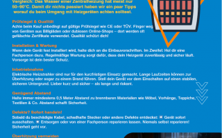 Installation & Wartung: Wenn Ihr Gerät installiert wird, halten Sie sich an die Einbauvorschriften. Im Zweifel: Holen Sie sich eine Fachperson dazu. Regelmäßige Wartung sorgt dafür, dass Ihr Heizgerät zuverlässig und sicher läuft.