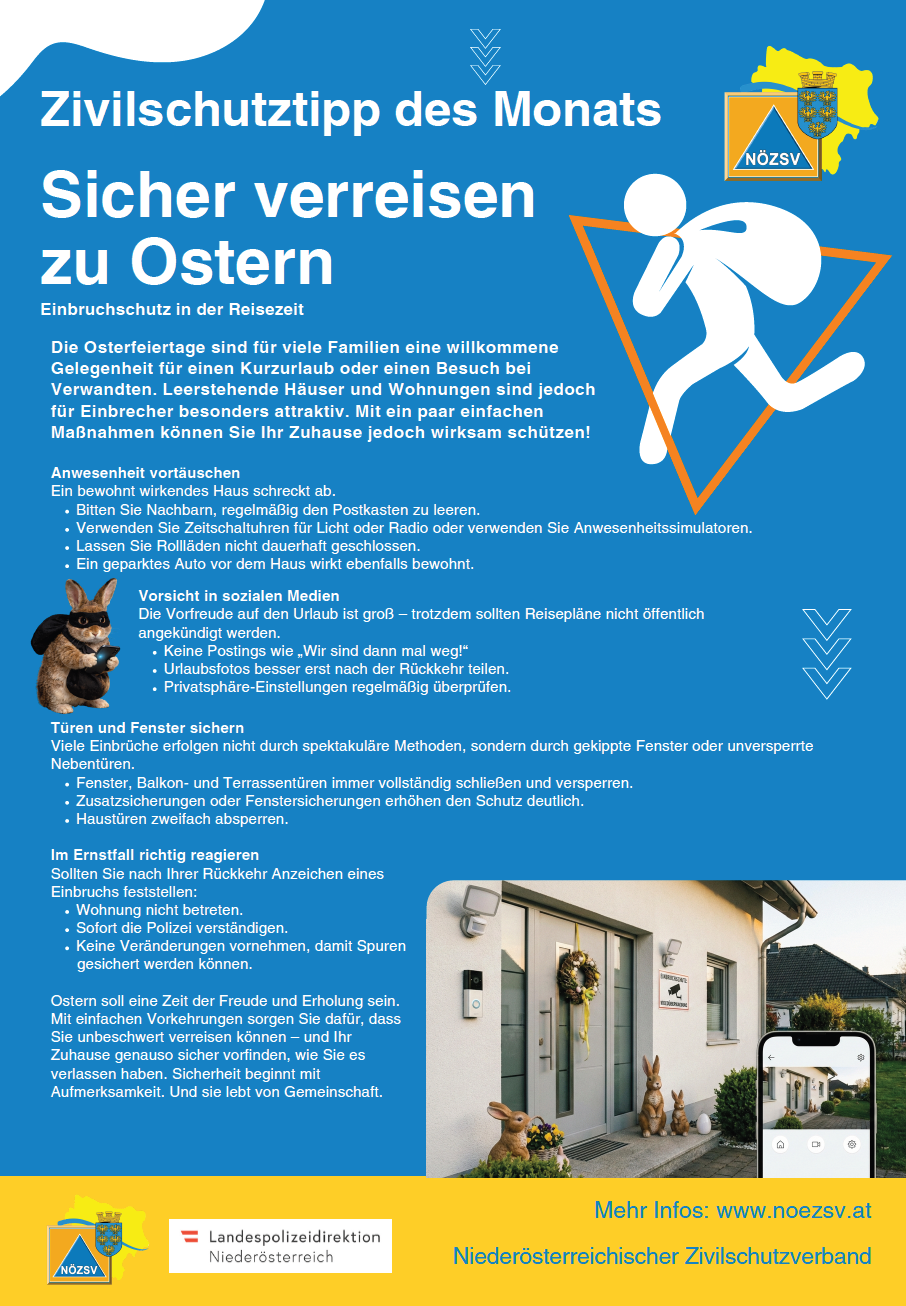 Ostern soll eine Zeit der Freude und Erholung sein. Mit einfachen Vorkehrungen sorgen Sie dafür, dass Sie unbeschwert verreisen können - und Ihr Zuhaus genauso sicher vorfinden, wie Sie es verlassen haben. Sicherheit beginnt mit Aufmerksamkeit. Und sie lebt von Gemeinschaft.